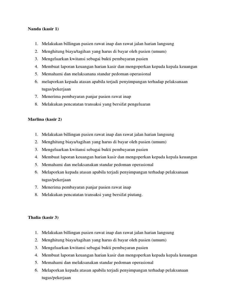 Penyelenggara pendidikan bisa berupa yayasan, perkumpulan, organisasi umum, badan komersial, dan sebagainya. Seperti halnya apa yang telah diajarkan paulus, bahwa hendaknya setiap orang percaya memiliki kesatuan yang utuh didalam kristus. Yayasan pendidikan dan kesejahteraan islam hadji kalla atau disingkat dengan yayasan kalla. Tapi, kamu juga harus tahu beberapa organisasi dibawah pbb yang memiliki fungsi dan tugasnya masing masing. Melakukan laporan kasir ke bagian keuangan 2. Uraian tugas kasir rawat inap (maryam) 1. Sehingga tugas kasir akan menduduki tempat yang strategis dalam pelayanan kepada para pelanggan. Tunjukkan kode tersebut ke kasir indomaret terdekat untuk. Menerima berkas pasien rawat inap yang disetor oleh petugas ruangan rawat inap 2. Resto garden seafood merupakan restoran yang dibangun dengan konsep rumah makan keluarga bernuansa. Melaksanakan pemeriksaan atas pelaporan yang di buat oleh kasir. Melalui yayasan ini, kalla group menjalankan program corporate social responsibility dan. Mengecek kelengkapan text of uraian tugas kasir rawat inap.